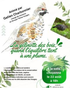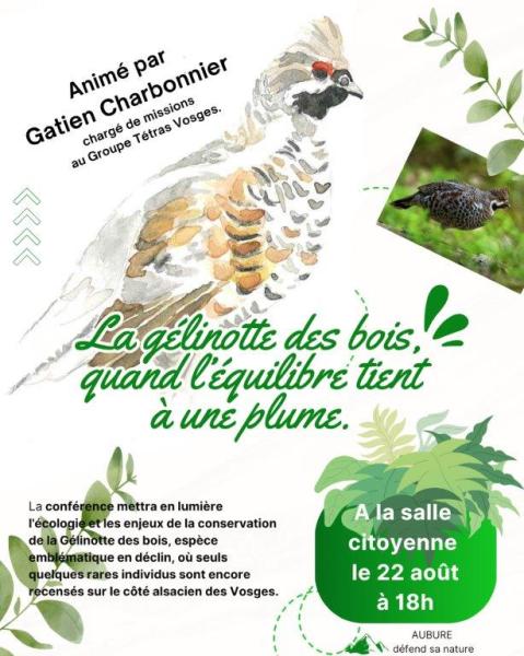 Rendez-vous le vendredi 22 août à 18h à la salle citoyenne d'Aubure pour une conférence sur la Gélinotte des bois. Cette conférence, d’1 heure, est ouverte à tous !